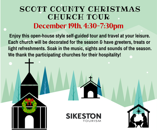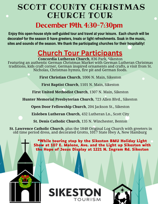 Christmas Church Tour of Scott County. Each church will be decorated for the season and will have treats or refreshments and music. Open house style tour. Visit each church at your leisure. Participating churches include Concordia Lutheran Church (featuring a German Christmas Market), First Baptist Church, First United Methodist Church, Hunter Memorial Presbyterian Church, Open Door Fellowship Church, Eisleben Lutheran Church (Scott City), St. Denis Catholic Church (Benton), St. Lawrence Catholic Church + 1848 original Log Church & Grotto (New Hamburg).
